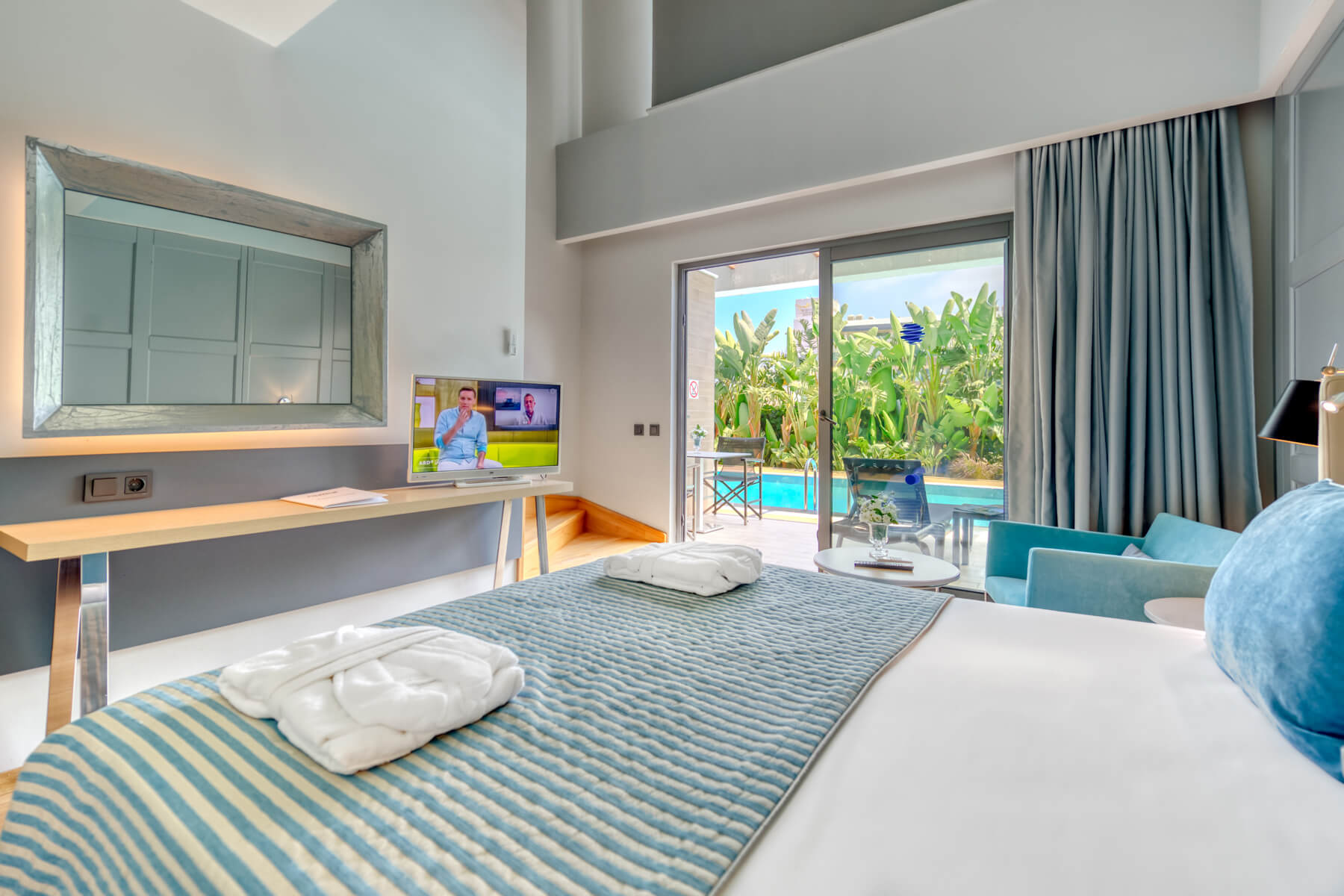 Numa Bay Exclusive предлагает спроектированных номеров Duplex Swim-Up площадью 45-52 квадратных метра, каждый из которых отделан по самым высоким стандартам. Эти номера залиты естественным светом и имеют прямой доступ к бассейну. Частная терраса обставлена стульями и шезлонгами, предлагая спокойное пространство в окружении пышных банановых деревьев и видов на бассейн. Изучите все характеристики номеров ниже.