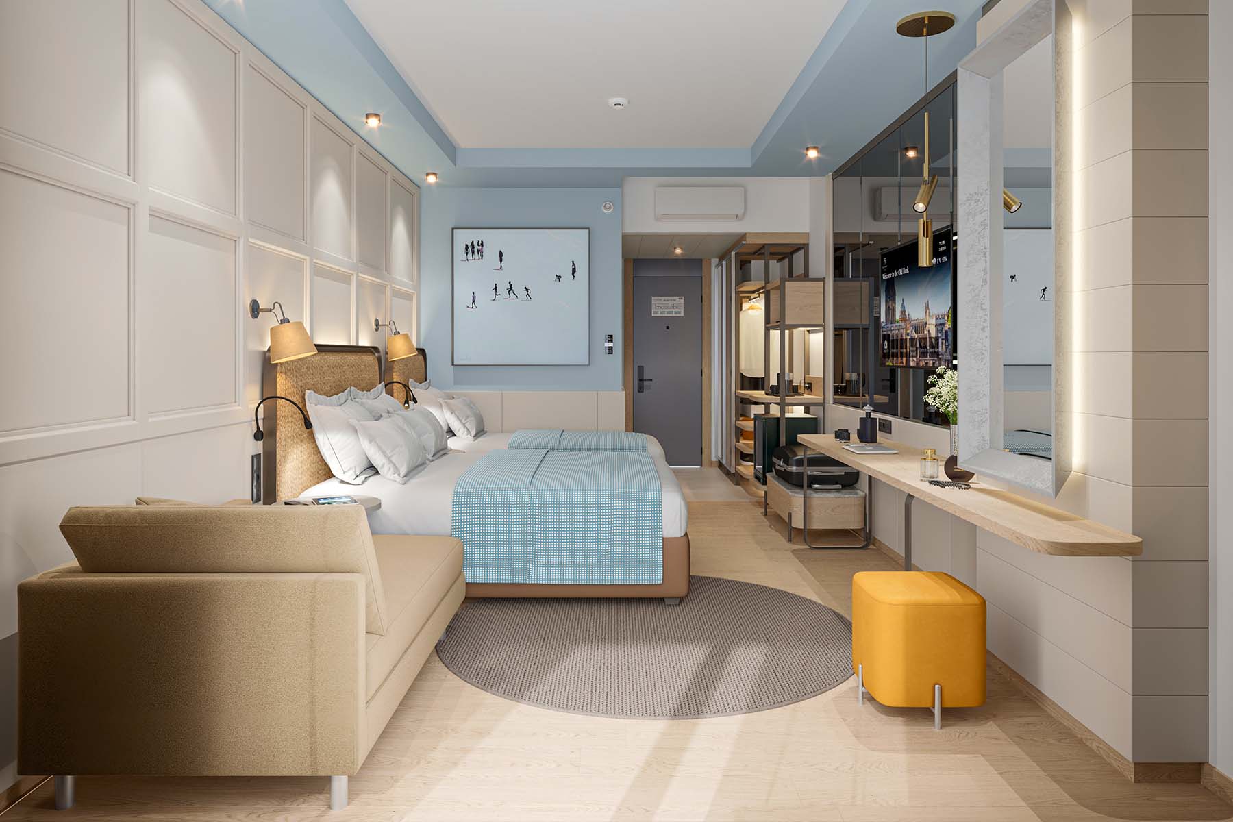 - Двуспальная кровать, односпальная кровать и диван-кровать