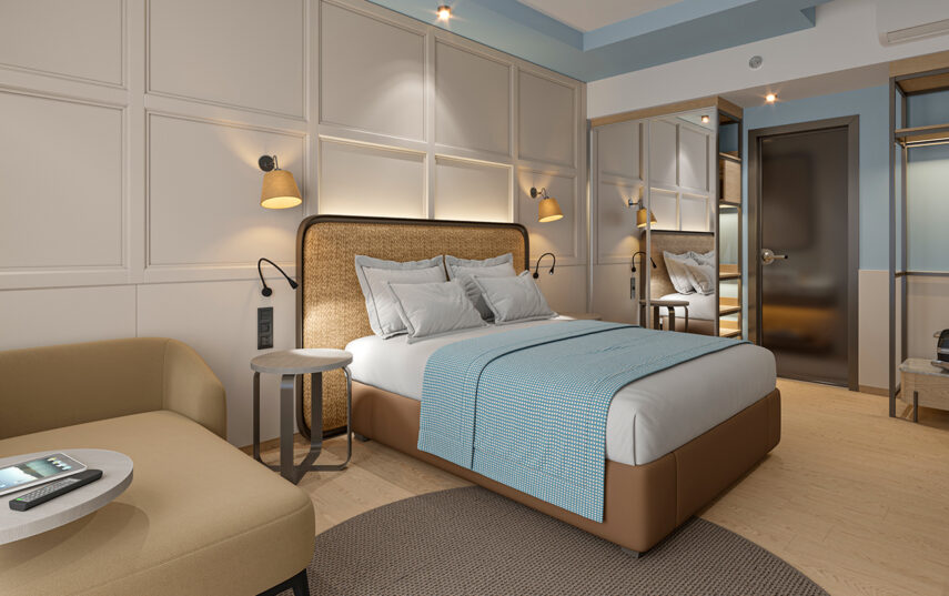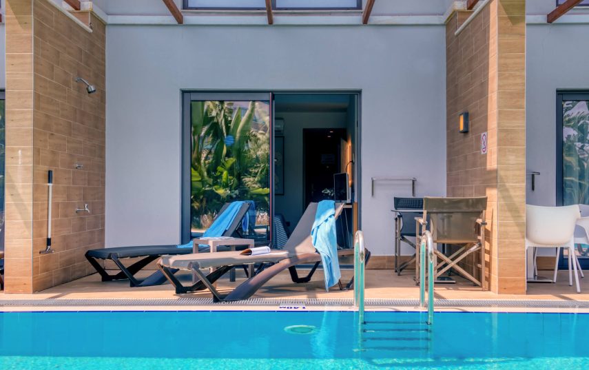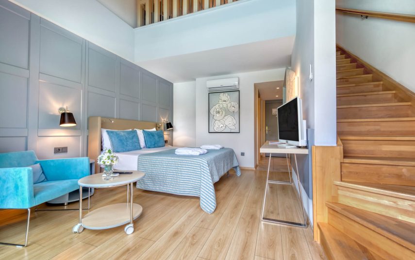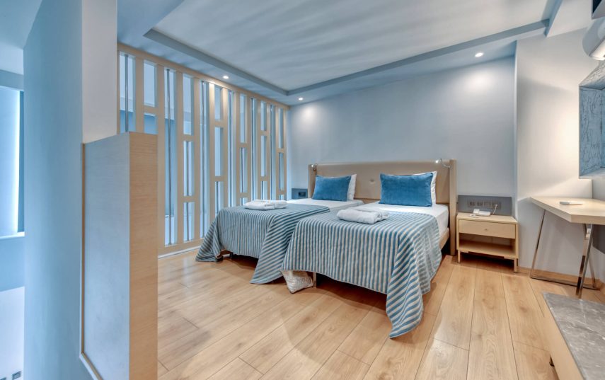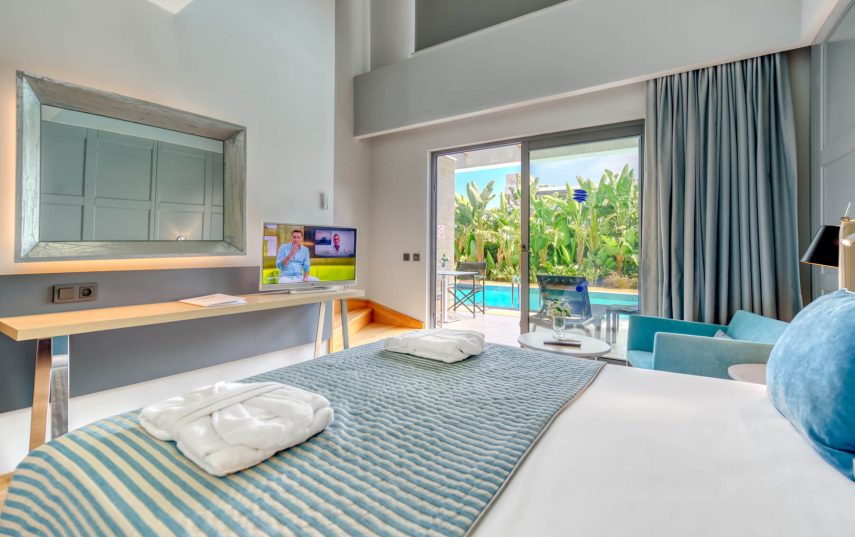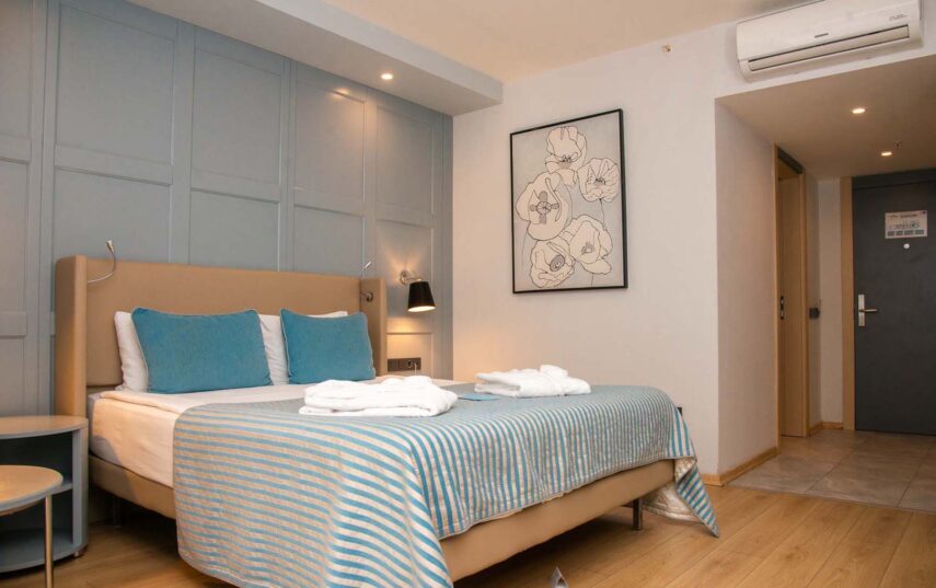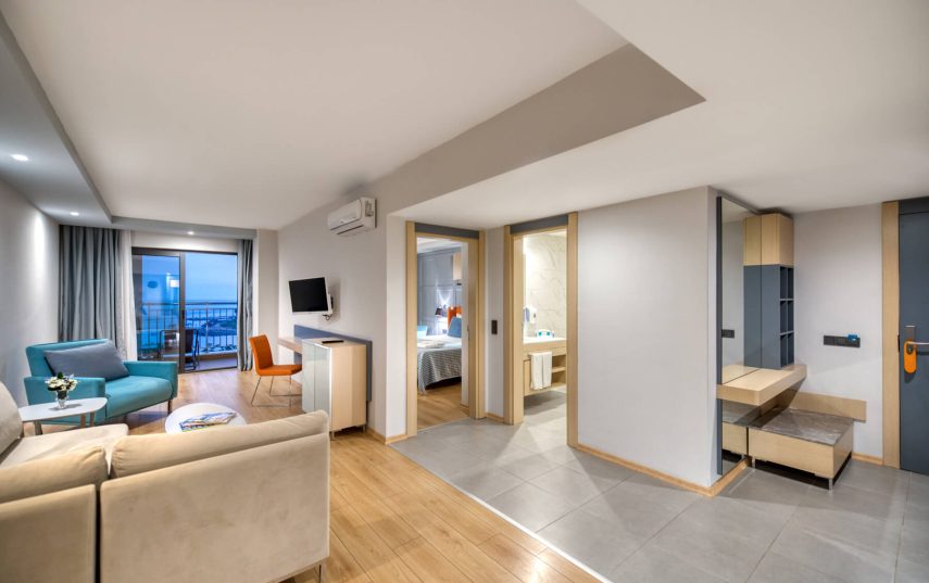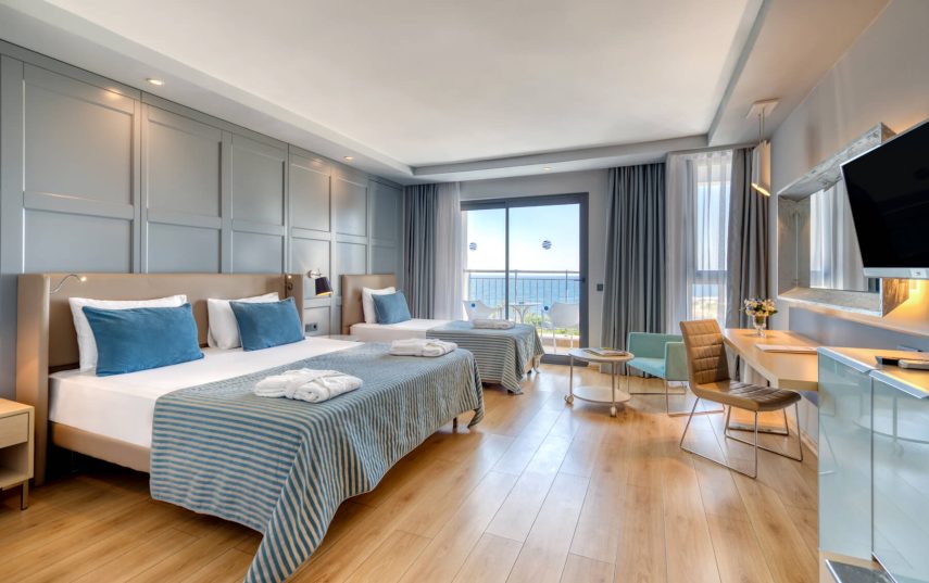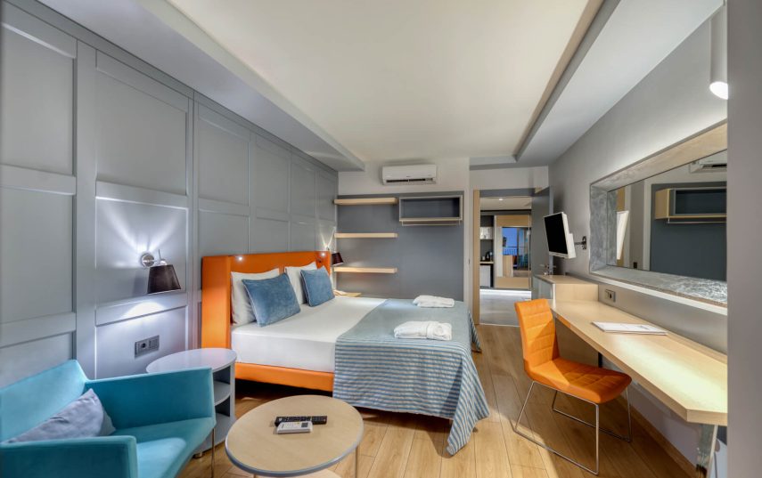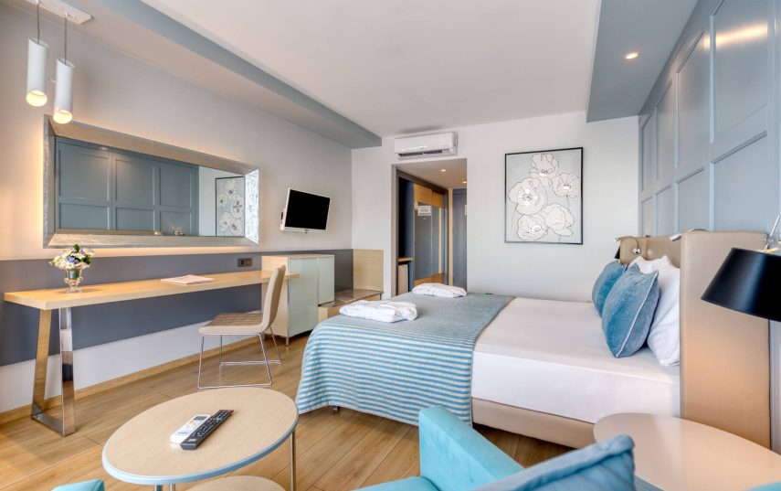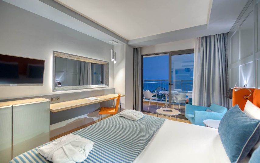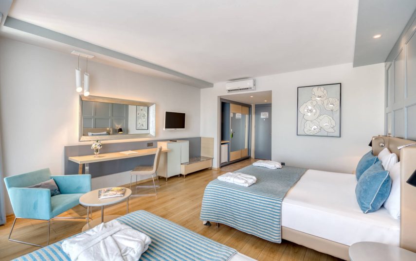 Numa Bay Exclusive предлагает номера категории Superior Swim-Up площадью 32 м². Эти элегантно оформленные номера оснащены ламинированным полом, собственным балконом и просторной спальней, обеспечивая современное и комфортное пребывание. Продуманная планировка с одной двуспальной кроватью, одной односпальной кроватью и диваном позволяет разместить до 2+1 или 3 гостей. Ванная комната оснащена современной душевой кабиной walk-in для дополнительного удобства.